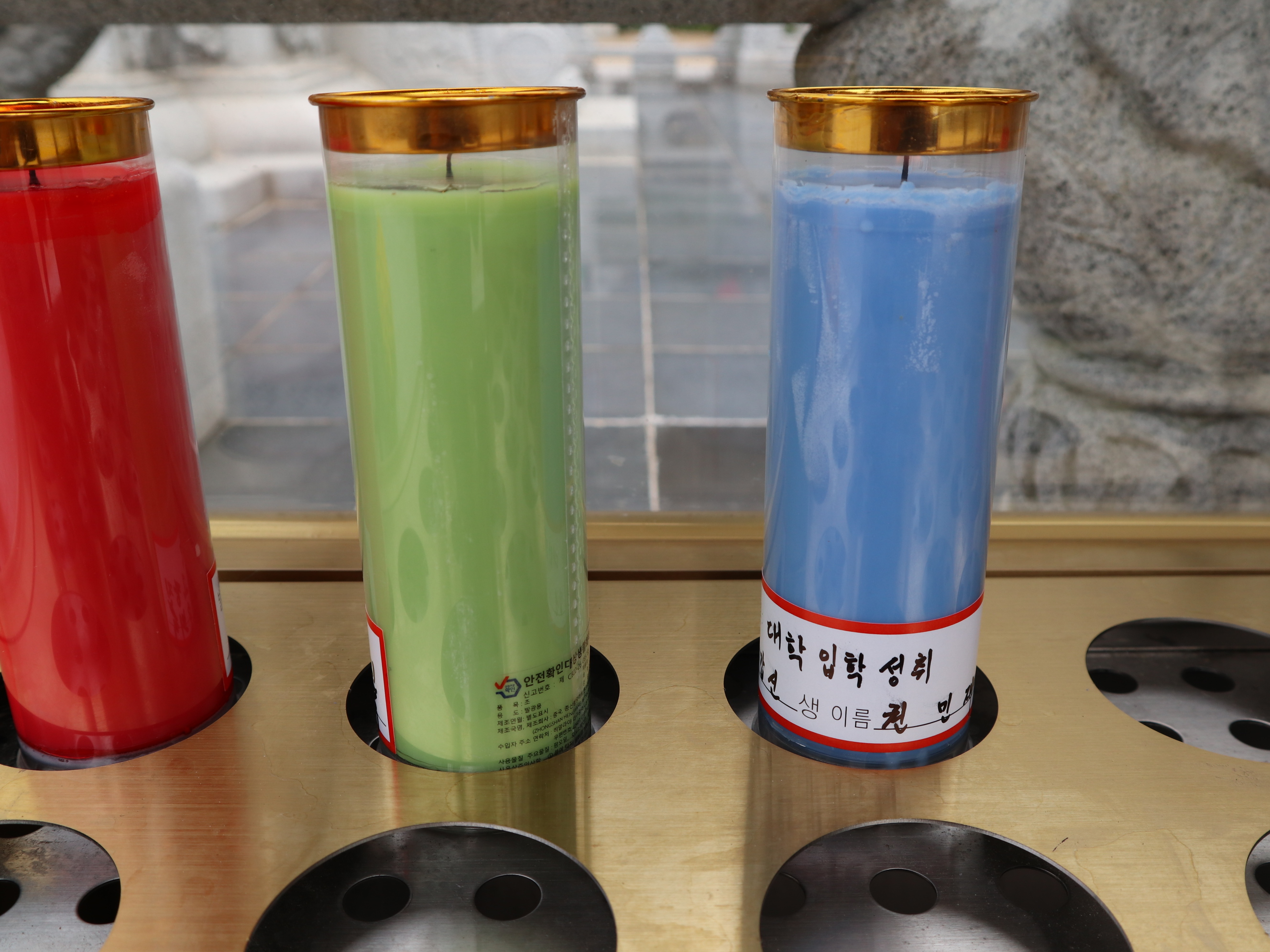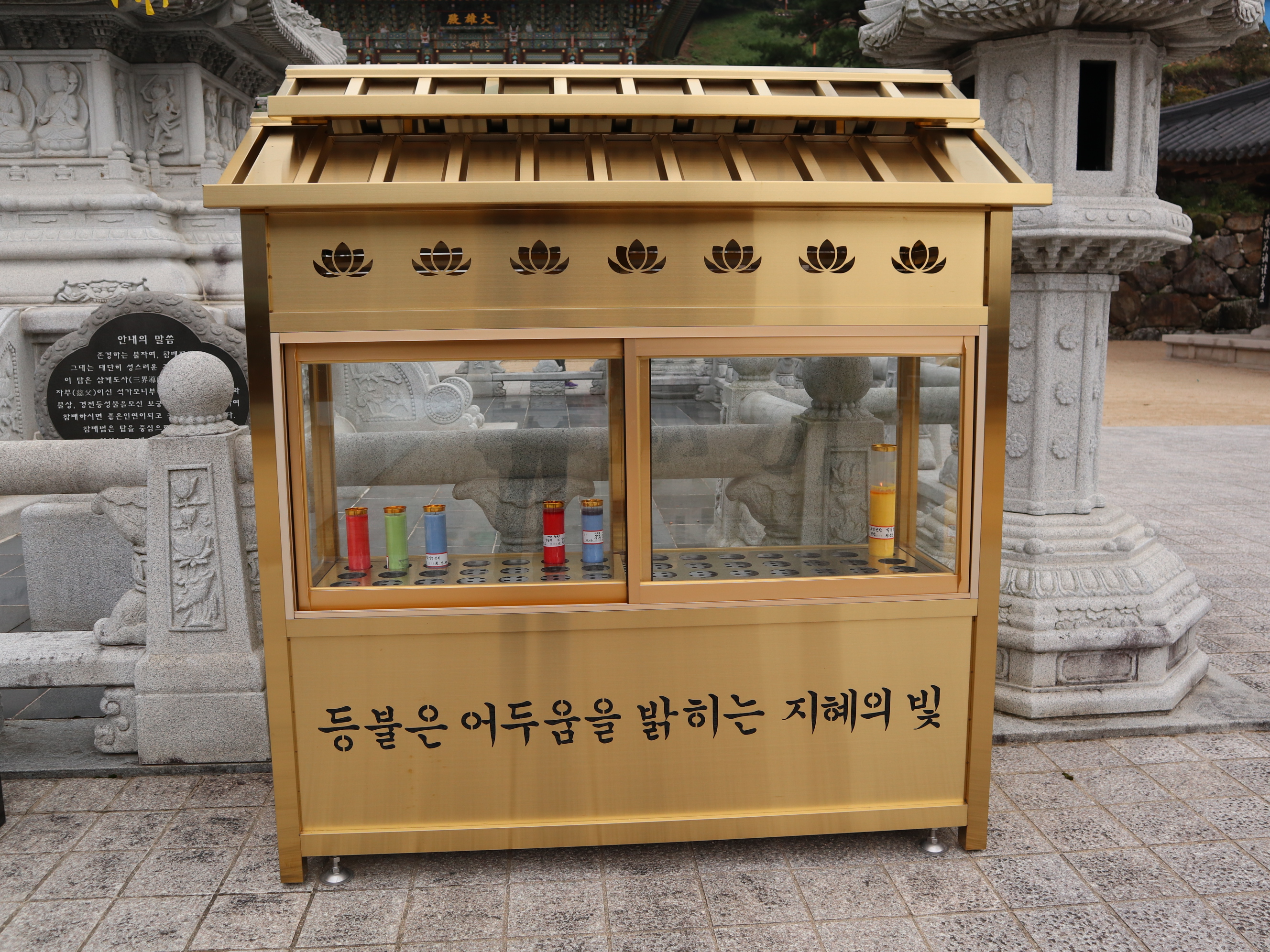 뜻에서 대형초를 사서 5층 석탑 앞 등불함에 넣어 촛불을 켜 놓았다.