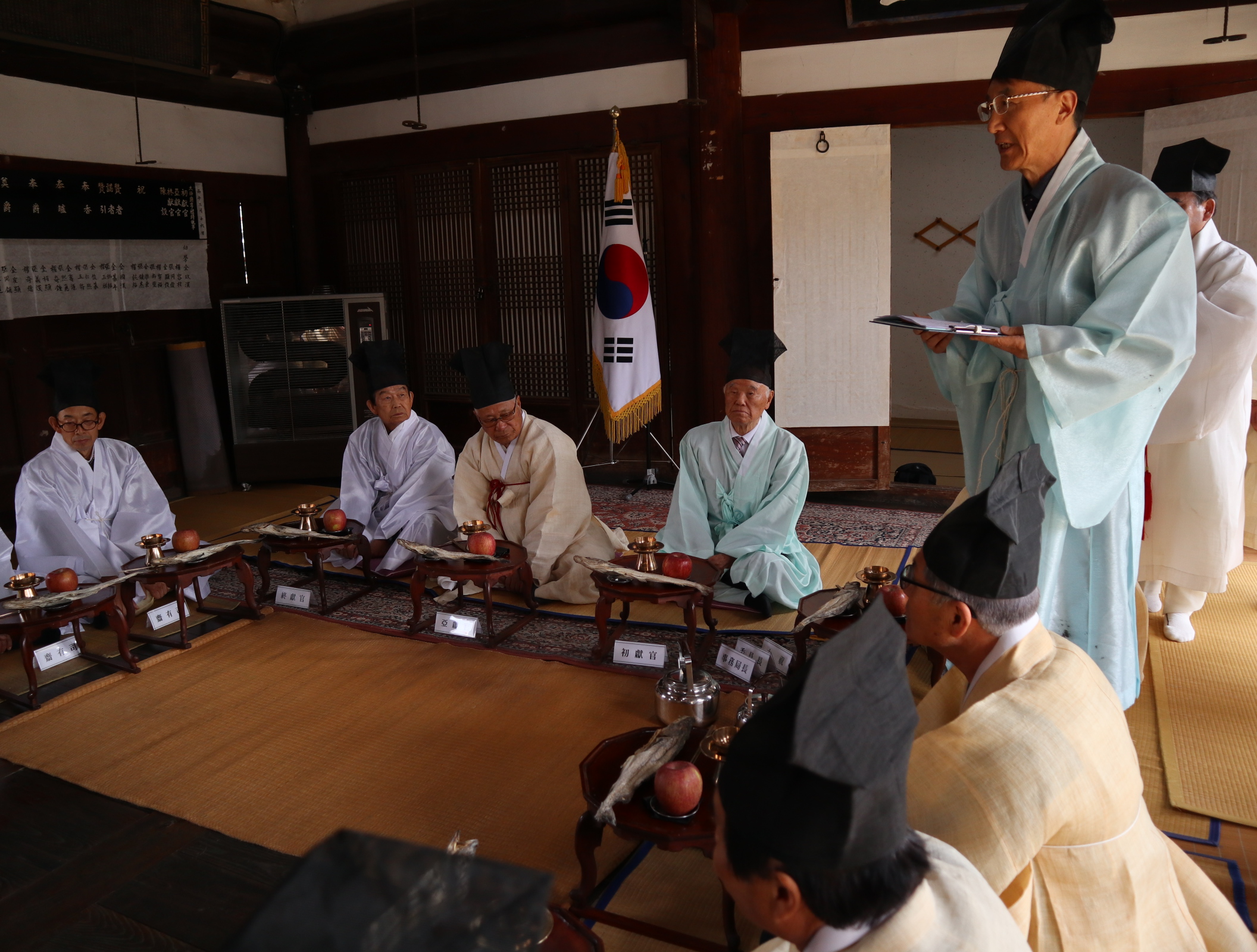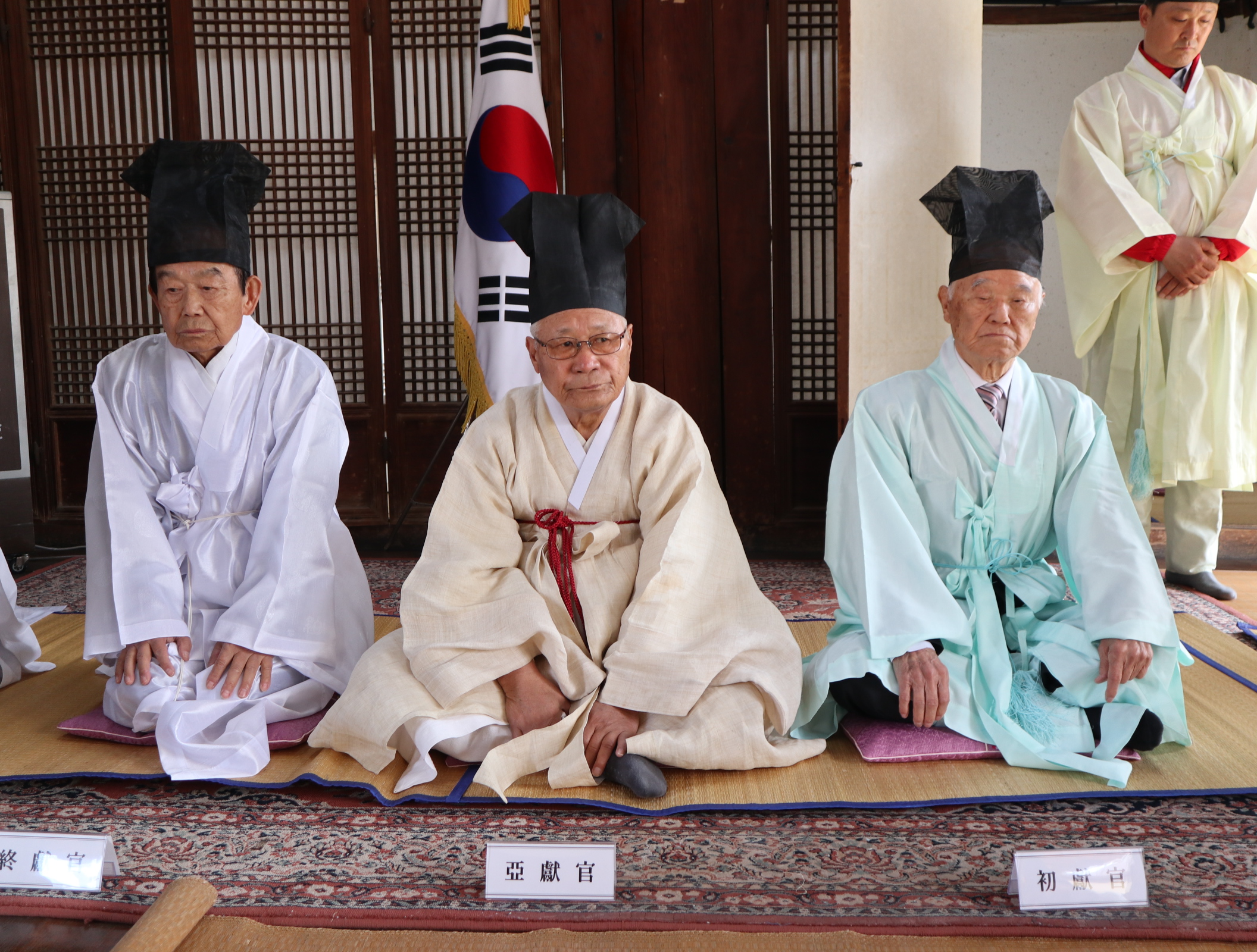 시조 위패 앞에서 서 있고, 이어 초헌관, 아헌관, 종헌관들이